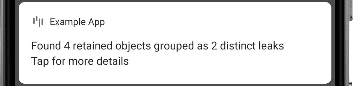 当分析完成后,LeakCanary会显示一个带有摘要的通知,并在Logcat中打印结果。请注意下面的4个保留对象是如何被归为2个不同的泄漏的。LeakCanary 为每个泄漏跟踪创建一个签名,并将具有相同签名的泄漏分组在一起,即由相同错误引起的泄漏。