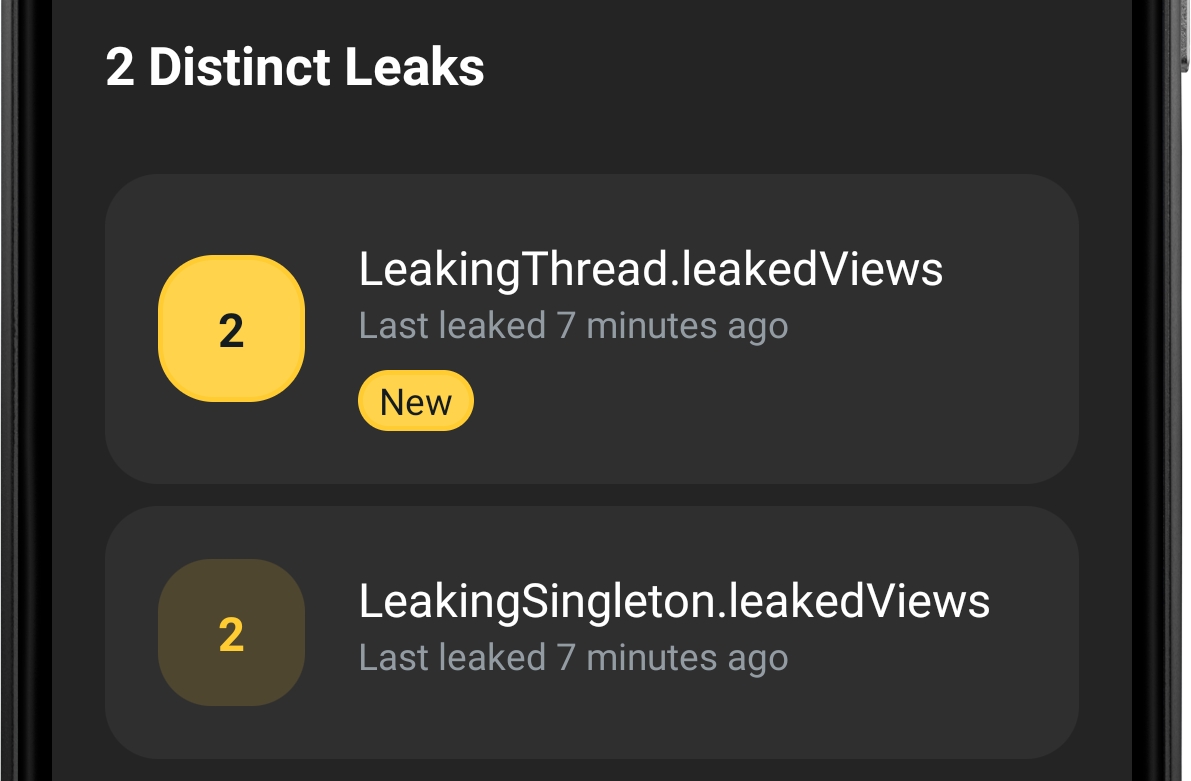 每一行对应于一组具有相同签名的泄漏。LeakCanary在应用程序首次触发具有该签名的泄漏时,将某行标记为 "New"。