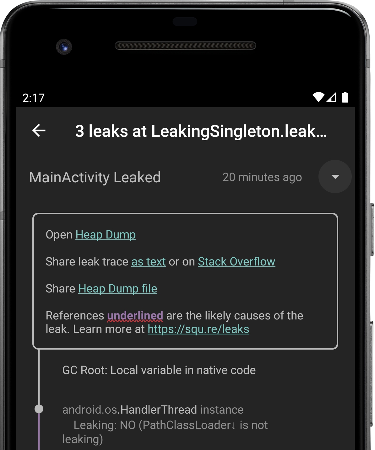 AppWatcher.objectWatcher.watch(myDetachedView, "View was detached")如果ObjectWatcher持有的弱引用在等待5秒并运行垃圾回收后没有被清除,被监视的对象就会被认为是被持有,并且有可能泄漏。LeakCanary将此记录到Logcat。