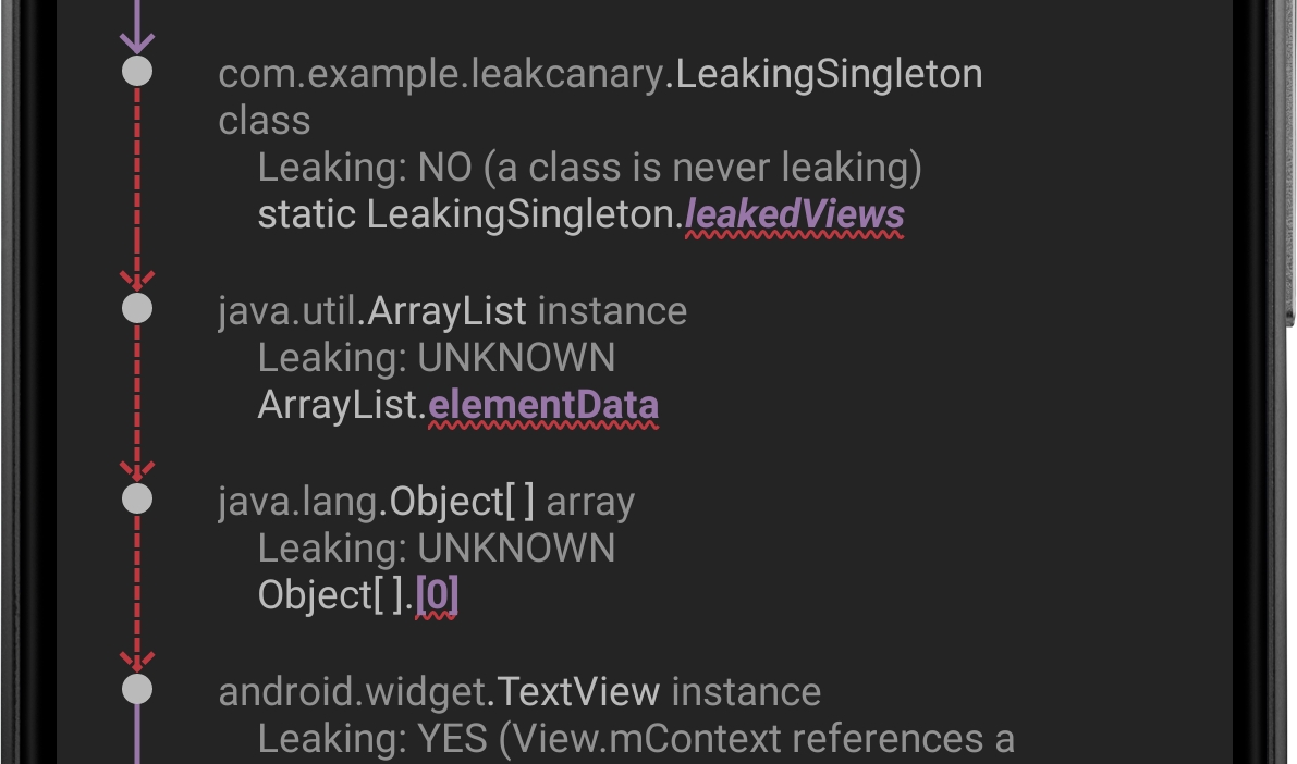 对于每个保留的对象,LeakCanary会找到防止该保留对象被垃圾回收的引用路径:它的泄漏跟踪。你将在下一节学习分析泄漏跟踪。修复内存泄漏。